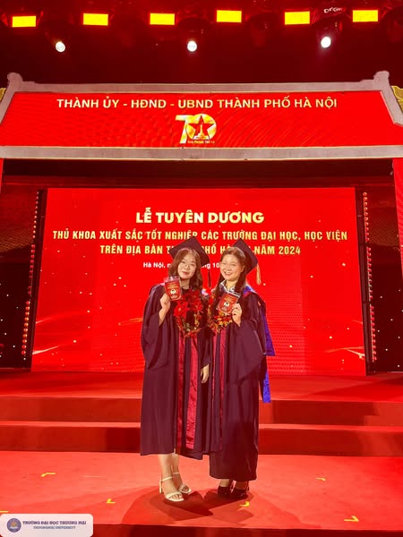 Trường Đại học Thương mại vinh dự có 02 Thủ khoa được xét chọn tham dự Lễ tuyên dương thủ khoa xuất sắc tốt nghiệp các trường đại học, học viện trên địa bàn năm 2024, gồm: sinh viên Bùi Hương Giang - Lớp K56DD1, Viện Kế toán - Kiểm toán và Lê Thùy Linh - Lớp K56B2KD, Khoa Khách sạn - Du lịch.