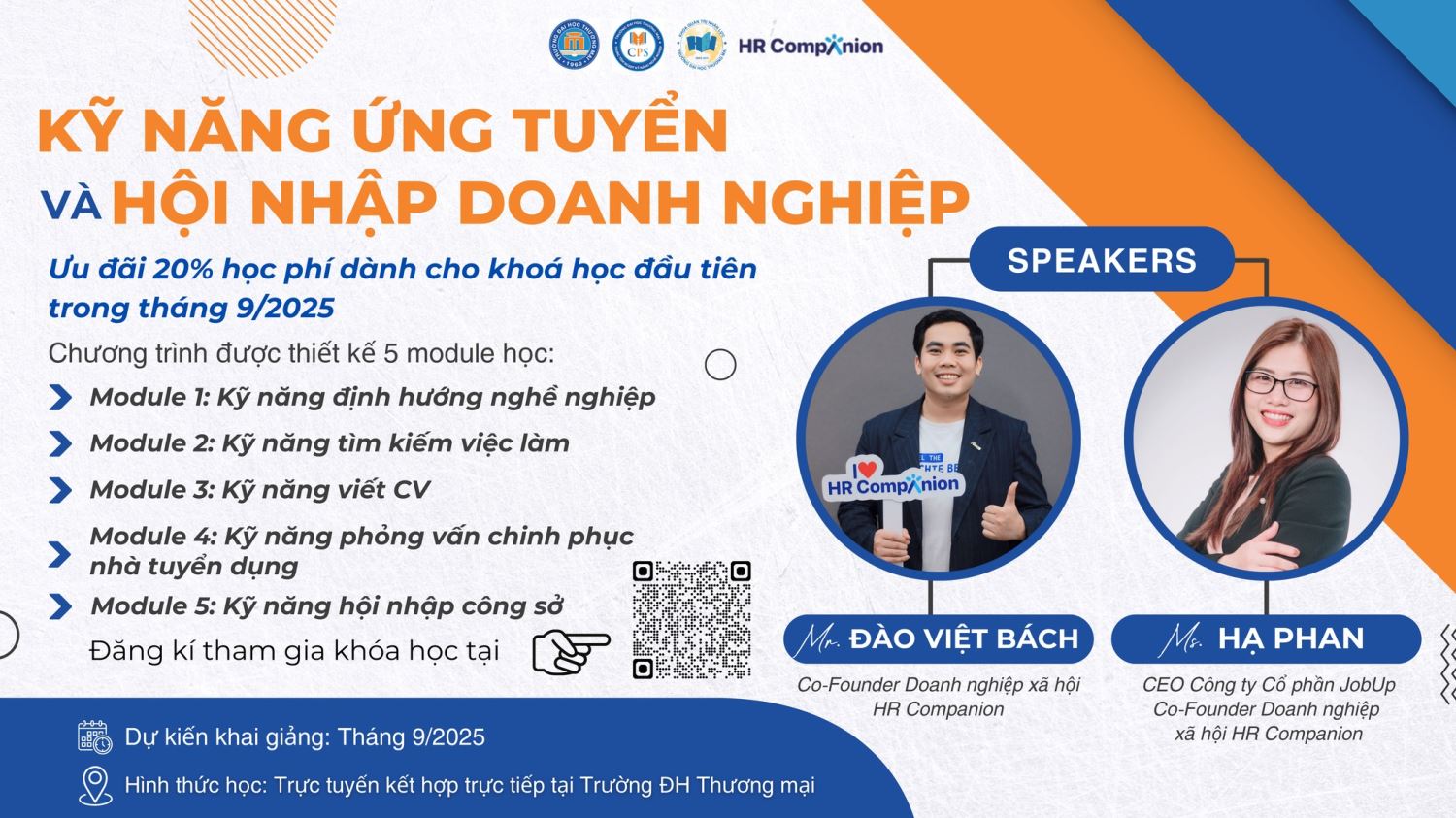 Với mong muốn giúp sinh viên chuẩn bị hành trang ngay từ khi còn trên ghế giảng đường, Trung tâm Nghiên cứu và Đào tạo Kỹ năng nghề nghiệp - Khoa Quản trị nhân lực, Trường Đại học Thương mại, phối hợp cùng HR Companion - doanh nghiệp xã hội tiên phong trong tư vấn, đào tạo và phát triển nguồn nhân lực trẻ, đã cùng nhau xây dựng khóa đào tạo "Kỹ năng Ứng tuyển & Hội nhập Doanh nghiệp" dành riêng cho sinh viên Trường Đại học Thương mại.